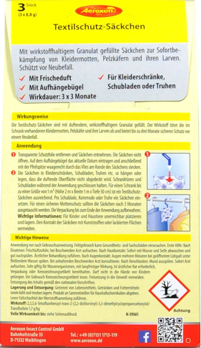 Aeroxon bietet dagegen ein Textilschutz-Säcken mit einem wirkstoffhaltigen Granulat. Und das sogar im Dreierpack. Das bedeutet bis zu 3×3 Monate Schutz vor den lästigen Gästen.