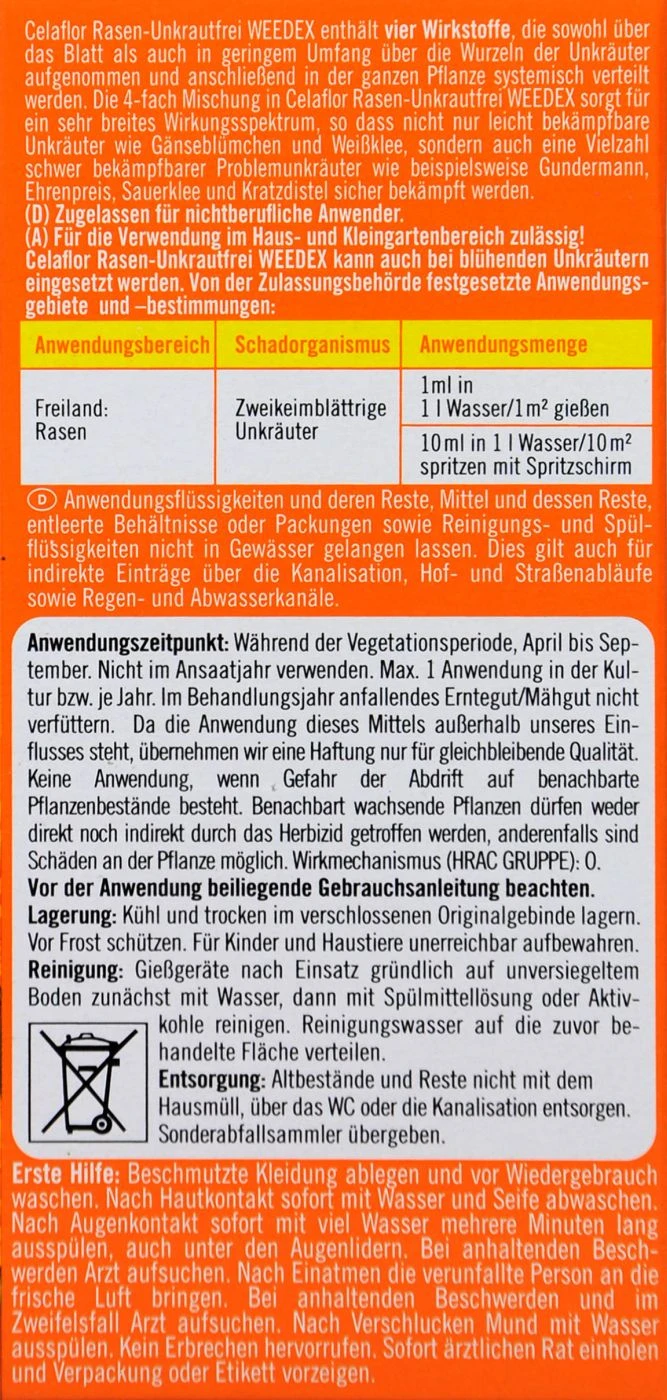 Rasen-Unkrautfrei Weedex von Celaflor hilft dir Löwenzahn und über 40 weitere Unkrautarten aus deinem Garten zu verbannen. Der 4-fach Wirkstoff wird über das Blatt und die Wurzeln aufgenommen und bekämpft auch hartnäckige Unkräuter. Dein Rasen wird dabei selbstverständlich geschont.