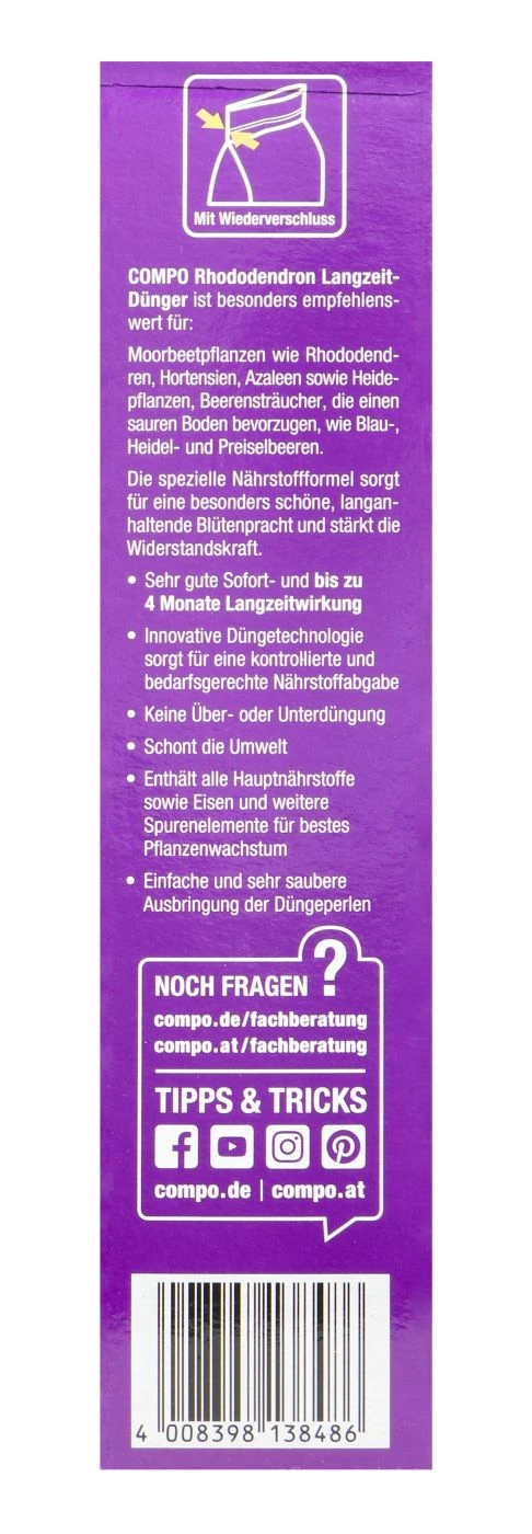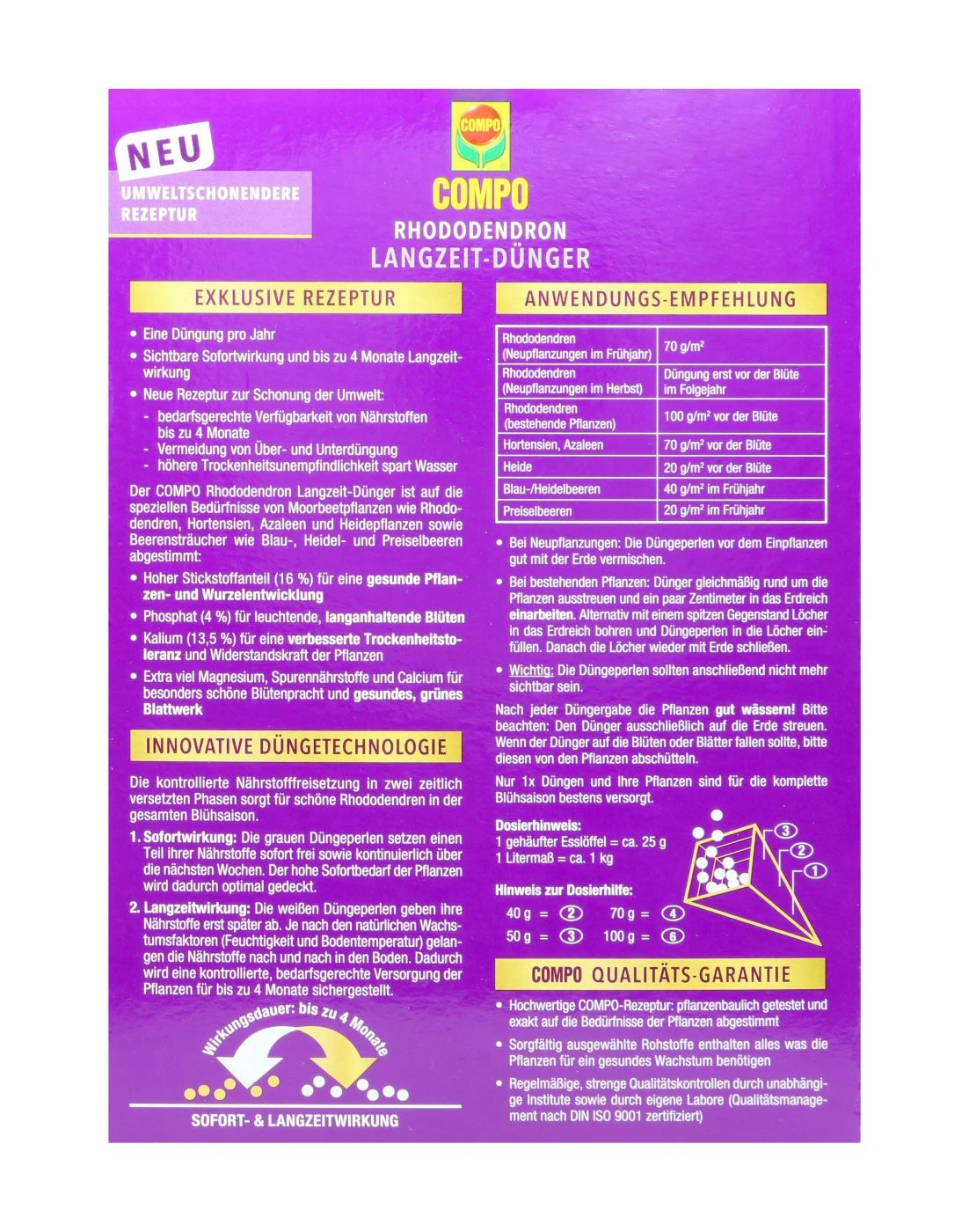 Damit auch dein Rhododendron außergewöhnlich blüht und besonders widerstandsfähig gegen Krankheiten ist, gönn ihm eine schöne Pflege. Mit Compo Rhododendron Langzeit-Dünger musst du deine Pflanzen nur einmal pro Saison düngen.